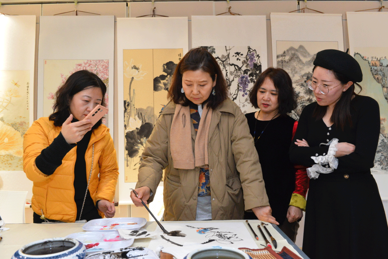 吉林省女美术家协会第七届书画展期间,来自民革、民盟、九三学社等各界的女书画家们与伟德bv国际体育的教师们齐聚学校B楼展厅,共同铺开画纸,挥毫拨墨。笔会现场,艺术家们创作了数十幅高水平画作,作品风格多样,涉及山水、花鸟、人物等题材。