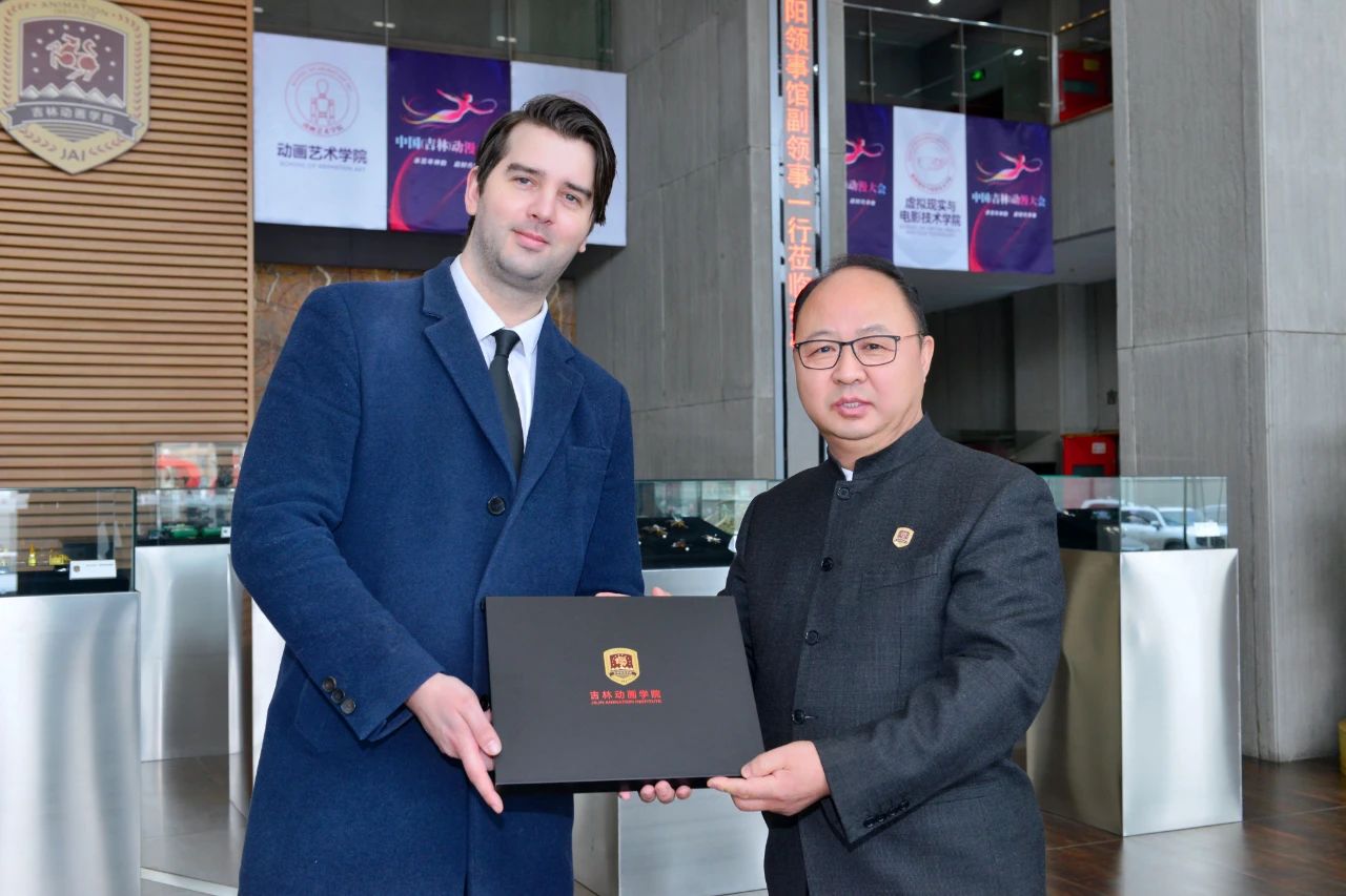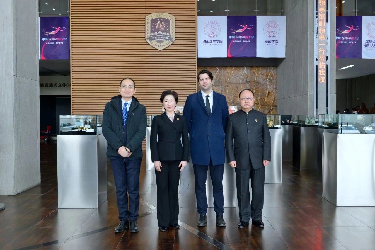 随后,罗伊可先生一行参观了学校校史馆、吉林国际动漫博物馆、学研产一体化创作成果展厅。在参观过程中,罗伊可先生对伟德官网取得的办学成果及国际化愿景表示赞赏,并对伟德官网师生原创作品《青蛙王国》表现了极大兴趣;对国际动漫博物馆所展出的艺术作品表示赞叹,特别对《西游记》的原创手稿展现了浓厚兴趣。
