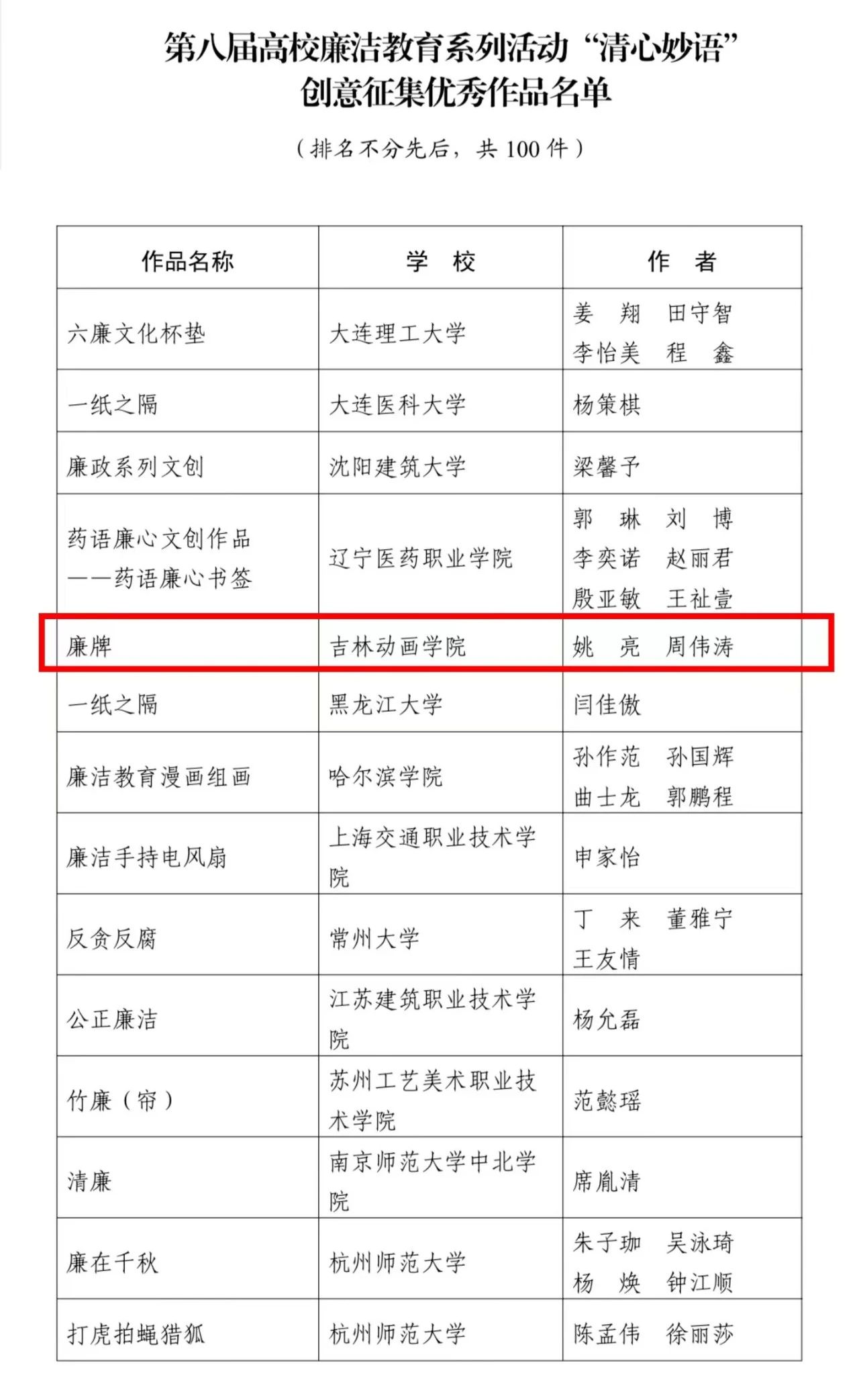 【JAI·荣】吉动学子原创作品《廉牌》获教育部奖项 发布时间:2023年10月19日 19:47:00 浏览:次 近日,教育部办公厅下发了“关于公布第八届高校廉洁教育系列活动结果的通知”。从通知中获悉,伟德官网文化产业商学院学生姚亮、周伟涛凭借原创作品《廉牌》在“清心妙语”创意征集中成绩突出,获全国优秀作品百强奖项,擦亮青春底色,书写新时代“清廉答卷”。 获奖名单(部分名单)