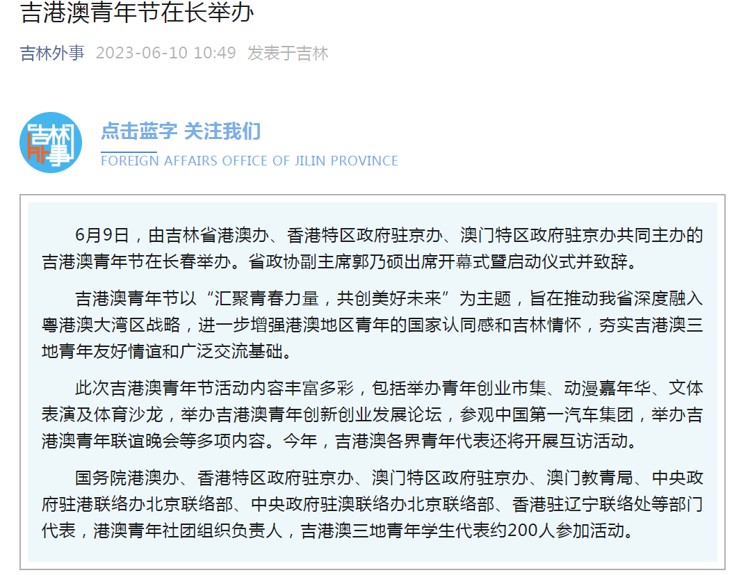 吉港澳青年节以“汇聚青春力量,共创美好未来”为主题,旨在推动我省深度融入粤港澳大湾区战略,进一步增强港澳地区青年的国家认同感和吉林情怀,夯实吉港澳三地青年友好情谊和广泛交流基础。