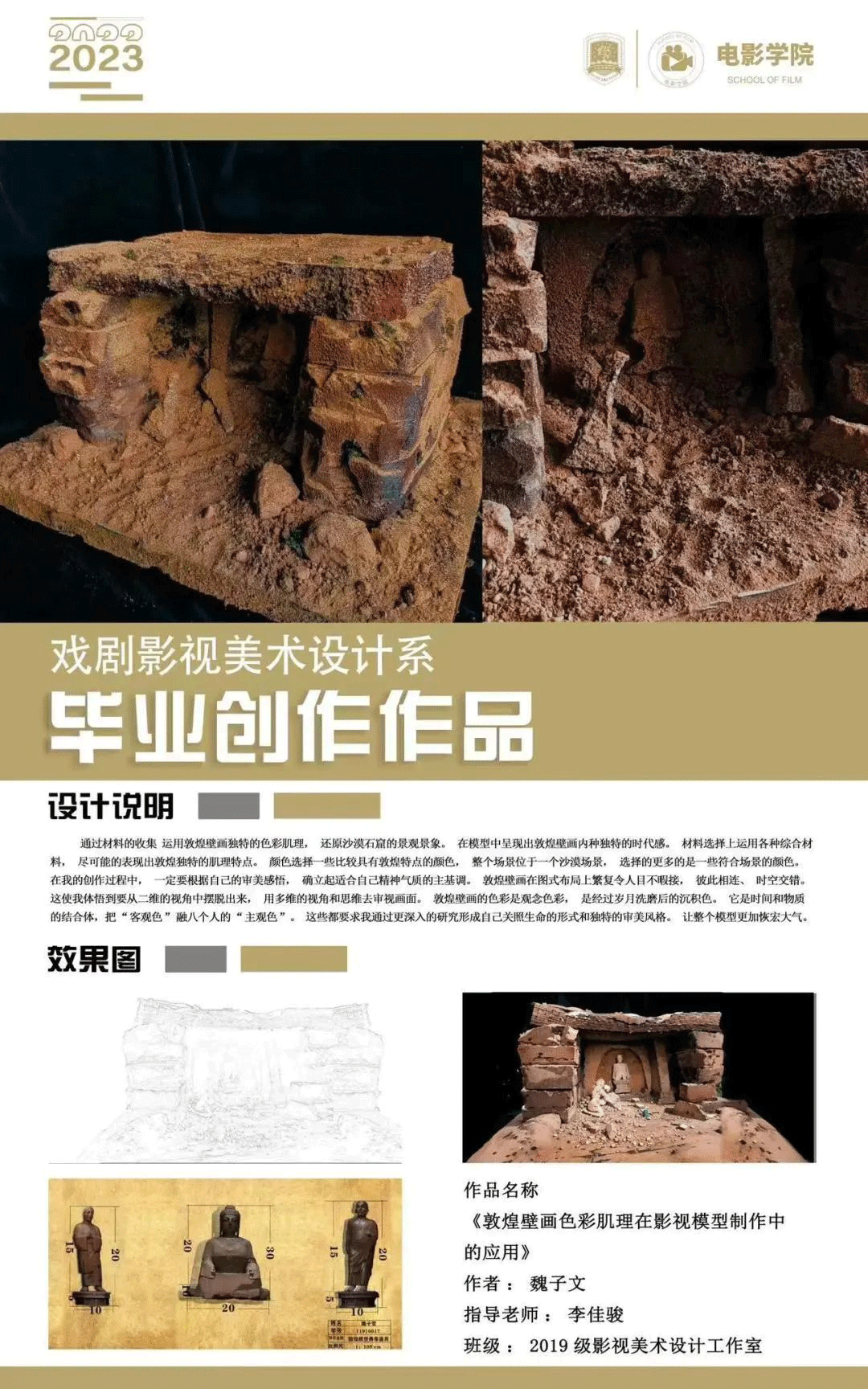 2019级影视美术设计工作室魏子文所创作的《敦煌》通过美术的语言讲述着敦煌故事,让敦煌文化内涵不断深入人心。“煌壁画在图式布局上繁复应接不暇,彼此相连,这使我体悟到要从二维的视角中摆脱出来,用多维的视角和思维审视画面。”该作品指导教师李佳骏告诉我们,毕业创作作品是运用敦煌壁画独特的色彩肌理,还原沙漠石窟的景象,在实物模型作品中呈现出敦煌壁画独特的时代感。
