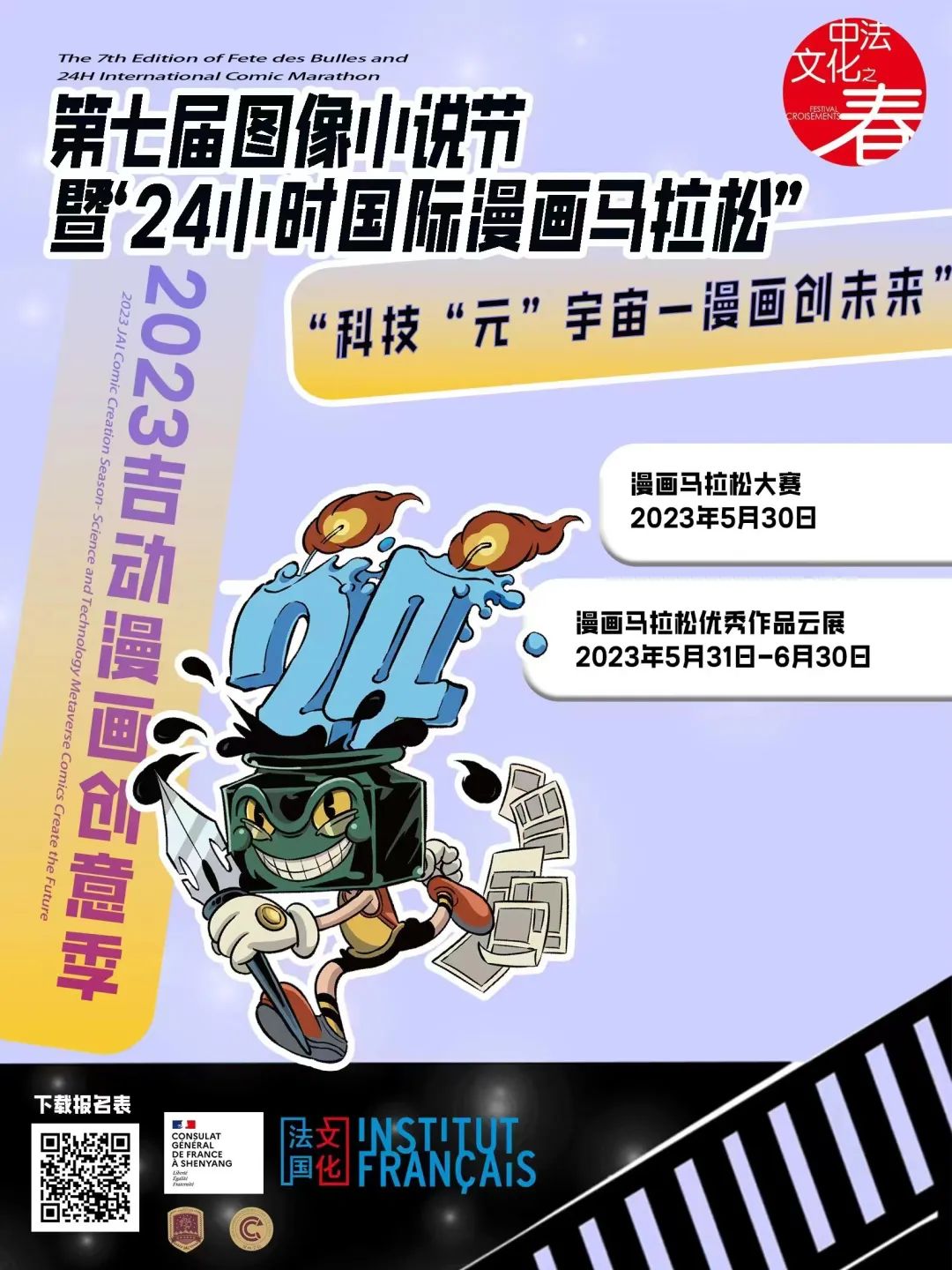 “第七届图像小说节”及其分支活动“24小说国际漫画马拉松”将于5月30日重磅开赛。参赛者扫描海报二维码下载报名表并填写,并于5月22日前,将签名的电子报名表,通过电子邮件发送至本赛事官方邮箱:zhaojianmei803@qq.com,邮件主题为“24小时国际漫画马拉松+姓名”。