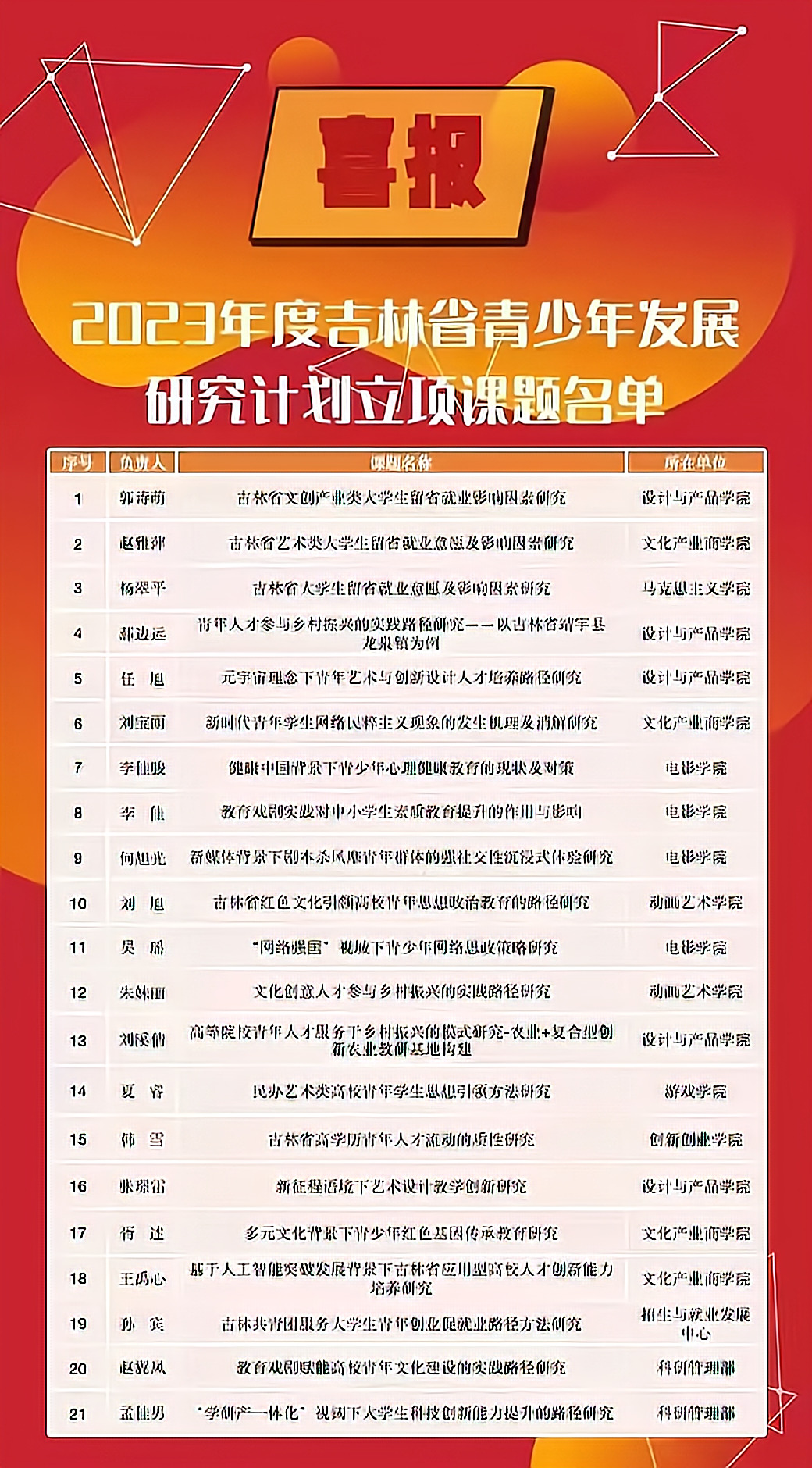 近日,共青团吉林省委员会下发《关于发布2023年度吉林省青少年发展研究计划立项课题名单的通知》,伟德官网共有21项课题获批一般项目立项,获批项目总数创伟德官网该课题立项总数的历史新高。