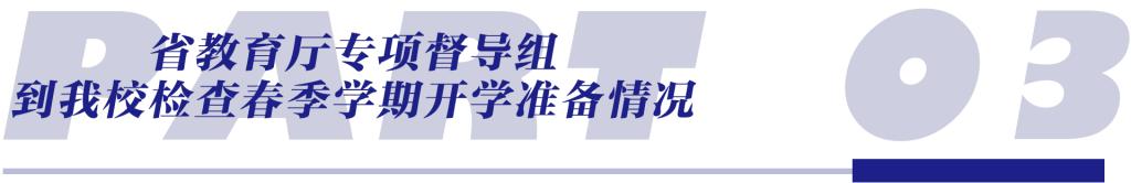2月14日下午,省教育厅高教处于文华带队来伟德官网督导检查春季学期开学准备情况。工作组通过听取汇报和实地考察,对学校开学各项准备工作给予充分肯定。