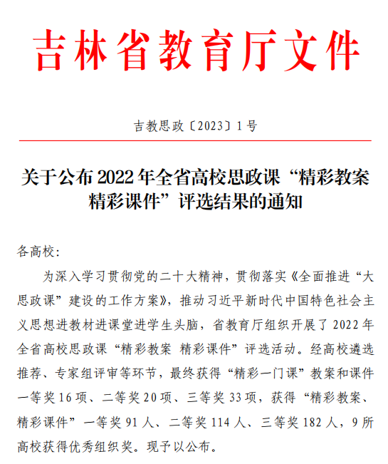 【JAI·赛】潜心耕耘,硕果飘香——马克思主义学院在全省高校思政课“精彩教案 精彩课件”比赛中喜获佳绩 发布时间:2023年01月13日 15:23:00 浏览:次 吉林省教育厅组织开展的2022年全省高校思政课“精彩教案 精彩课件”评选结果近日揭晓,伟德bv国际体育荣获团队及个人共计8个大奖: 其中王金老师的教案和课件获“精彩教案 精彩课件”类别一等奖;张绍珂、王金、蒋乔欣、陈杨组成团队的“毛泽东思想和中国特色社会主义理论体系概论”课获得“精彩一门课”类别二等奖;刘越、孙建峰、董金芳、张绍珂、朱浩、曹丽丽六位教师的教案和课件获得“精彩教案 精彩课件”三等奖。 一、“精彩一门课”获奖