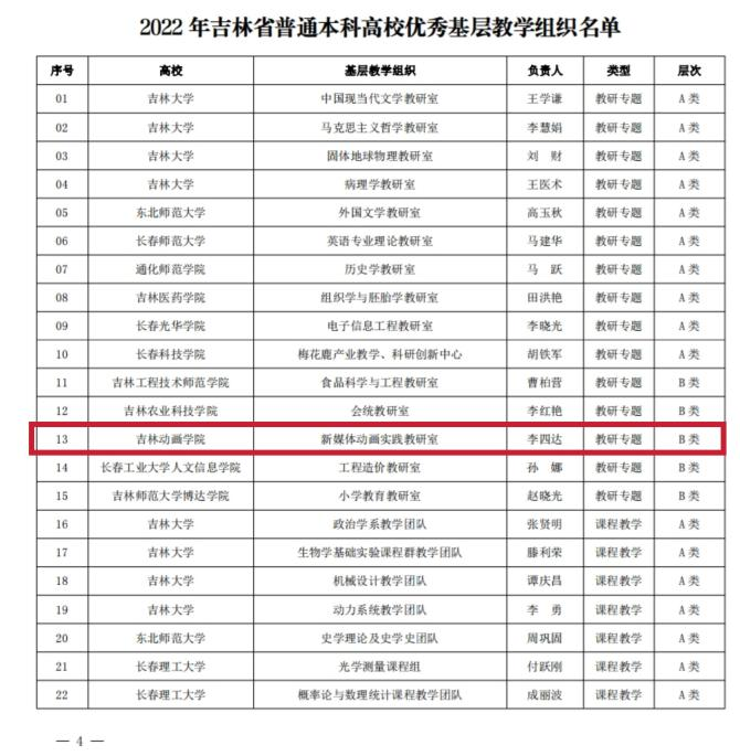 近日,吉林省教育厅公布2022年吉林省普通本科高校优秀基层教学组织名单,经高校推荐、专家评审,伟德官网动画艺术学院新媒体动画实践教研室荣获吉林省普通本科高校优秀基层教学组织称号。