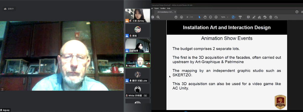 【JAI·学】动画艺术学院师生“走进”法国大师工作坊 发布时间:2022年11月11日 14:03:00 浏览:次 为提升动画专业国际化建设水平、推动新媒体动画专业方向国际化的跨学科人才培养,动画艺术学院邀请伟德官网客座教授、3iS法国国际音像学院专家教师埃里克·雷格先生,于2022年10月17日—11月2日期间组建线上短期大师工作坊,围绕“装置艺术与交互动画设计”专题与校内师生展开线上交流及创作指导,让学生接触并了解先进创作理念,拓展国际视野,从而全面提升师生实践创新能力、跨文化交际能力。 ▲埃里克·雷格先生线上授课