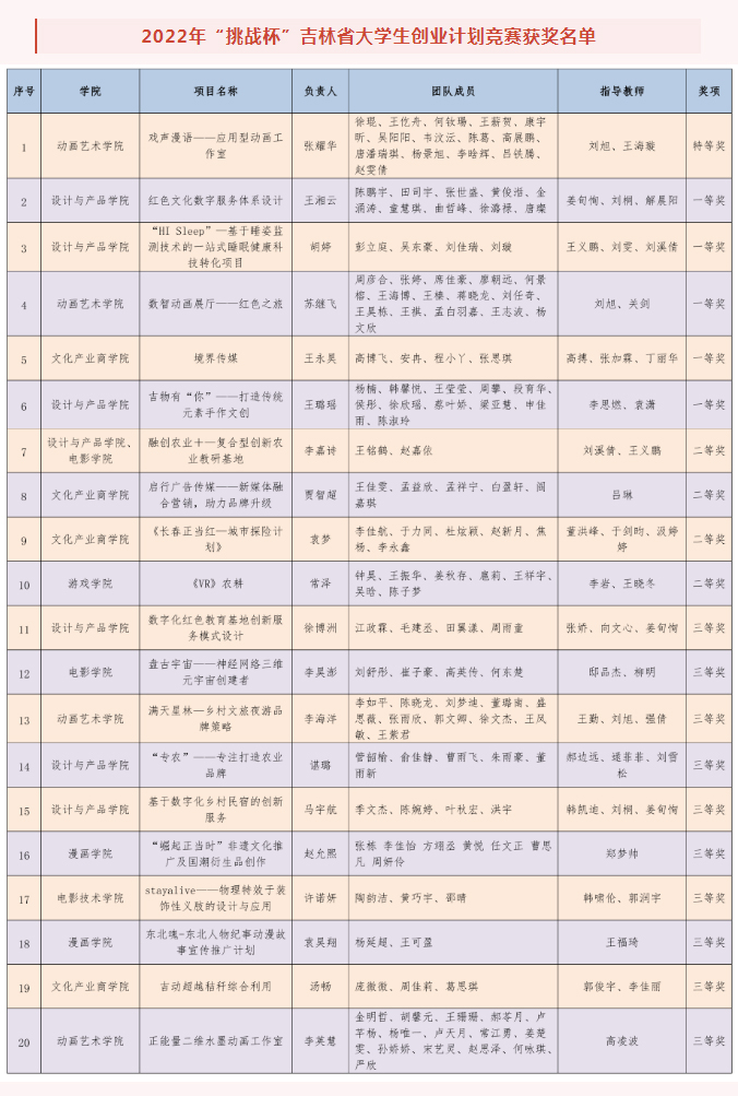 近日,由共青团吉林省委、吉林省人力资源和社会保障厅、吉林省科学技术协会、吉林省学生联合会联合举办的2022年“挑战杯”吉林省大学生创业计划竞赛结果揭晓,伟德官网20件作品获奖,其中特等奖1项、省一等奖5项、省二等奖4项、省三等奖10项。