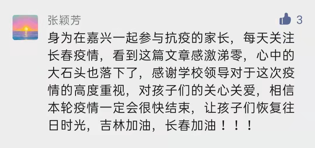 “张颖芳”在评论区留言中说:“身为在嘉兴一起参与抗疫的家长,每天关注长春疫情,看到这篇文章感激涕零,心中的大石头也落下了,感谢学校领导对于这次疫情的高度重视。对孩子们的关心关爱,相信本轮疫情一定会很快结束,让孩子们,恢复往日时光!