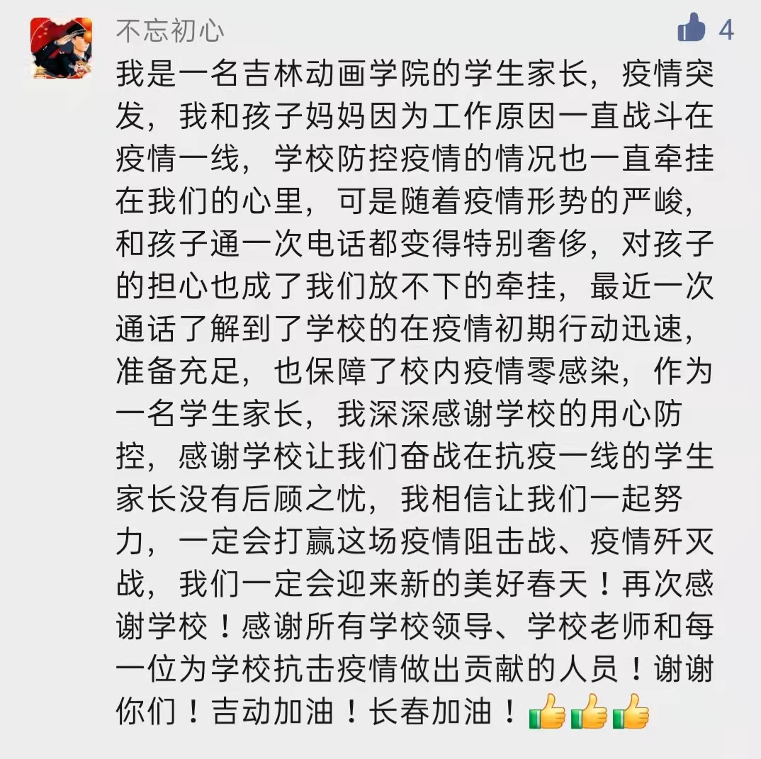 网名“不忘初心”的家长说:“我是一名伟德bv国际体育的学生家长,疫情突发,我和孩子妈妈因为工作原因一直战斗在疫情一线。学校防控疫情的情况也一直牵挂在我们的心里。......最近与孩子一次通话了解到学校的在疫情初期行动迅速,准备充足,也保证了现阶段校内疫情零感染。作为一名学生家长,我深深感谢学校的用心防控,感谢学校让我们奋战在抗战一线的学生家长没有后顾之忧,.....长春加油!”