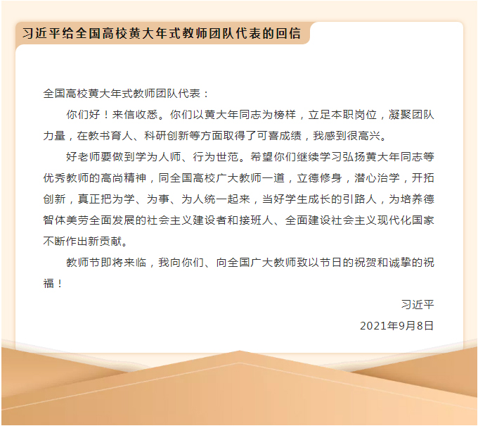 9月9日,习近平给全国高校黄大年式教师团队代表回信。他在信中表示对黄大年式教师团队在教书育人、科研创新等方面取得了可喜成绩而感到很高兴,同时向全国广大教师致以节日的祝贺和诚挚的祝福!