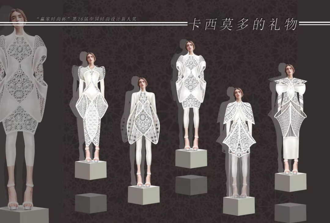 我院范鑫宇的作品《卡西莫多的礼物》在5月19号下午实物答辩中,评审专家给出了一致好评并指出,大面积运用激光镂空技术加工面料想法大胆,面料的选择和处理方式也恰到好处,服装整体的设计特点鲜明且具有层次感,图案的布局也十分精准。