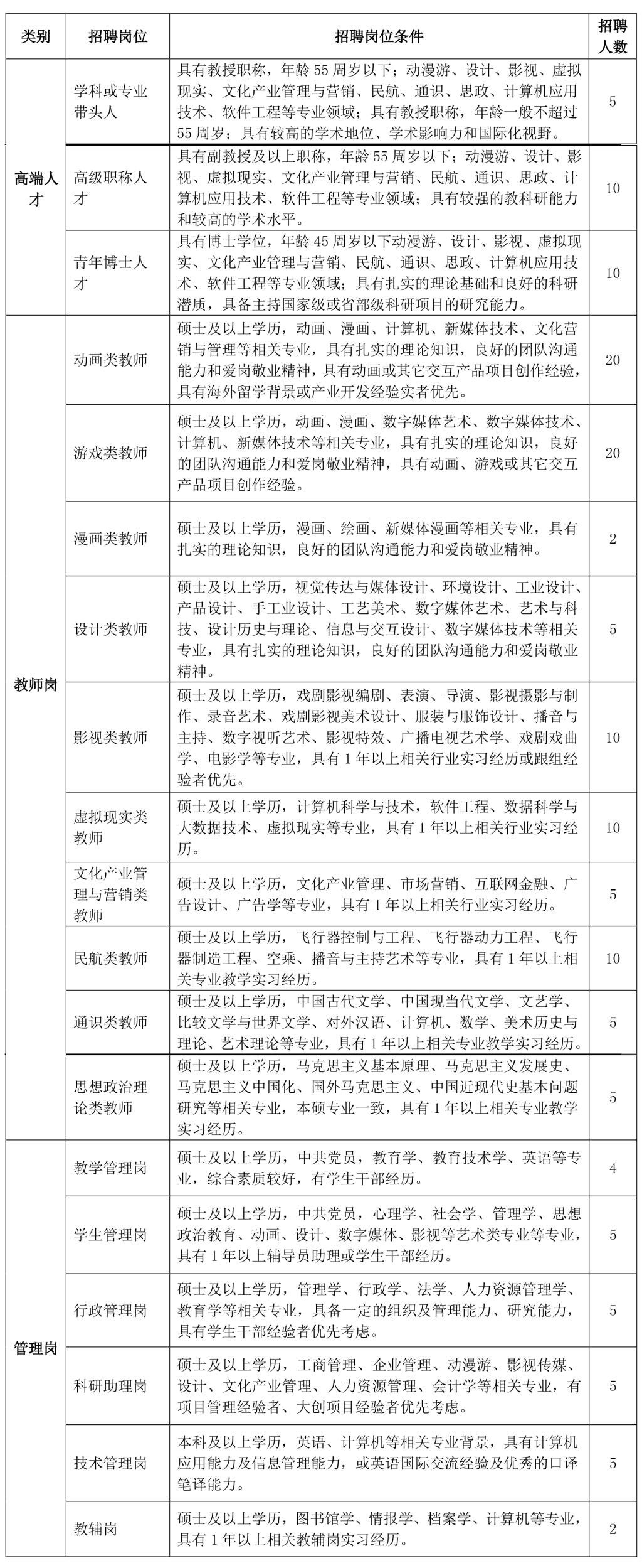 伟德bv国际体育围绕学校发展战略及目标定位,基于事业发展需要,面向海内外各高校广泛招聘动漫游、设计、影视、计算机、人工智能与虚拟现实、广告学、文化产业管理、民用航空、文学、法律、管理等专业高端人才、博士、教授、副教授、行业高端人才及优秀应届毕业生,从事教学、科研、行政管理、专业技术等岗位。诚挚欢迎优秀人才加盟吉动,集聚智慧,共谋发展!