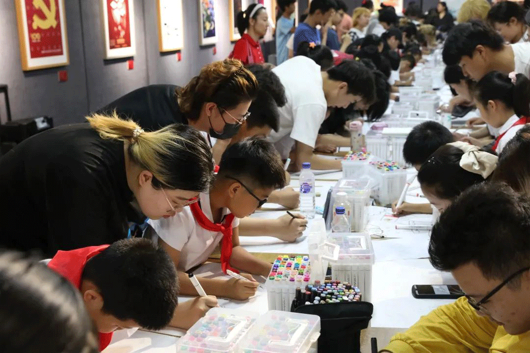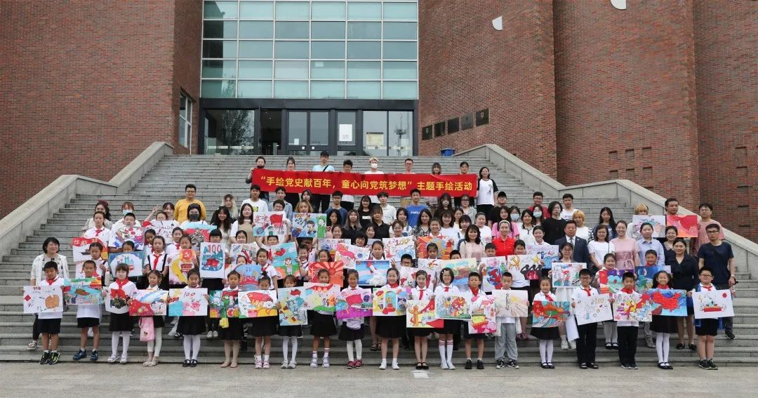在活动现场,伟德官网50名大学生和东北师范大学附属小学繁荣校区50名小学生共同创意、共同完成了50幅绘画作品。学生们用画笔描绘出了心中最美的画卷,表达出对中国共产党成立100周年的美好祝福:鲜红的党旗、雄伟的天安门、绵延的万里长城、秀丽的祖国山河……在学生的笔下一一呈现,形式多样,生动传神。