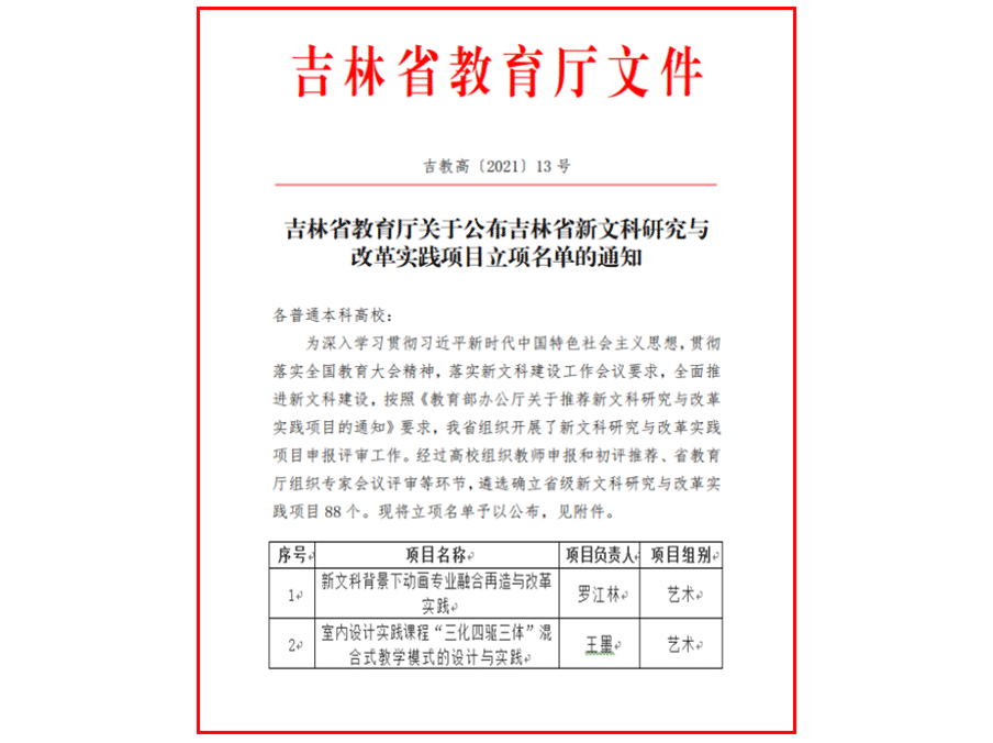 近日,吉林省教育厅公布了吉林省新文科研究与改革实践项目立项结果,伟德官网申报的《新文科背景下动画专业融合再造与改革实践》、《室内设计实践课程“三化四驱三体”混合式教学模式的设计与实践》2个项目成功获批立项,其中由罗江林副校长主持的《新文科背景下动画专业融合再造与改革实践》已入选为推荐教育部的20个项目之一。