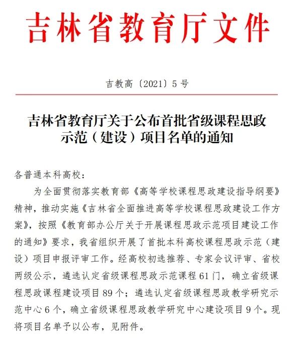 近年来,学校深入贯彻落实《高等学校课程思政建设指导纲要》(教高〔2020〕3号),根据中共吉林省高校工委、吉林省教育厅《吉林省全面推进高等学校课程思政建设工作方案》(吉教高〔2020〕25号)等文件要求,全面推动课程思政改革,强化课程思政建设水平,学校出台了《伟德bv国际体育“课程思政”教学改革试点工作方案》《伟德bv国际体育全面推进课程思政建设工作实施方案》等文件,开展了“学科育人示范课程”“课程思政示范(建设)项目”“课程思政教学研究项目”“课程思政教学案例库”等一系列建设工作,深挖各类课程的思政育人功能,提升立德树人成效和人才培养质量。