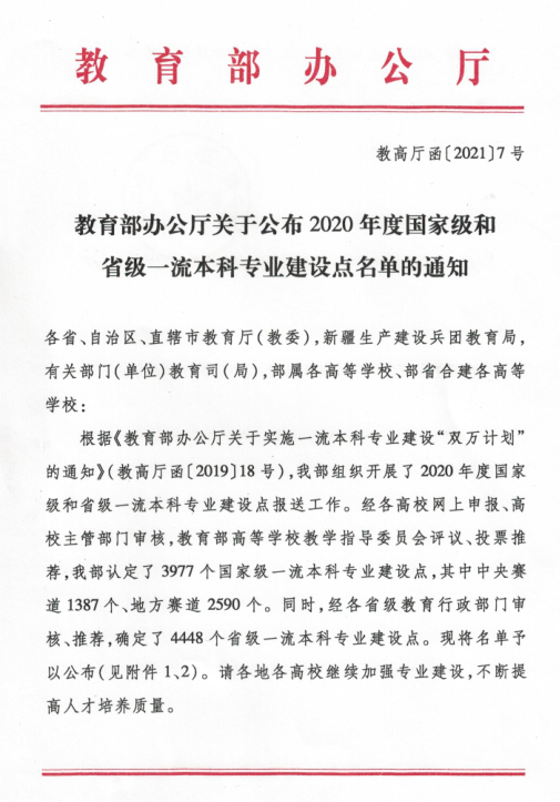 近日,教育部办公厅下发了《关于公布2020年度国家级和省级一流本科专业建设点名单的通知》(教高厅函[2021]7号),公布了2020年一流本科专业“双万计划”建设点名单。伟德官网数字媒体艺术专业获批国家级一流本科专业建设点,环境设计专业获批省级一流本科专业建设点。
