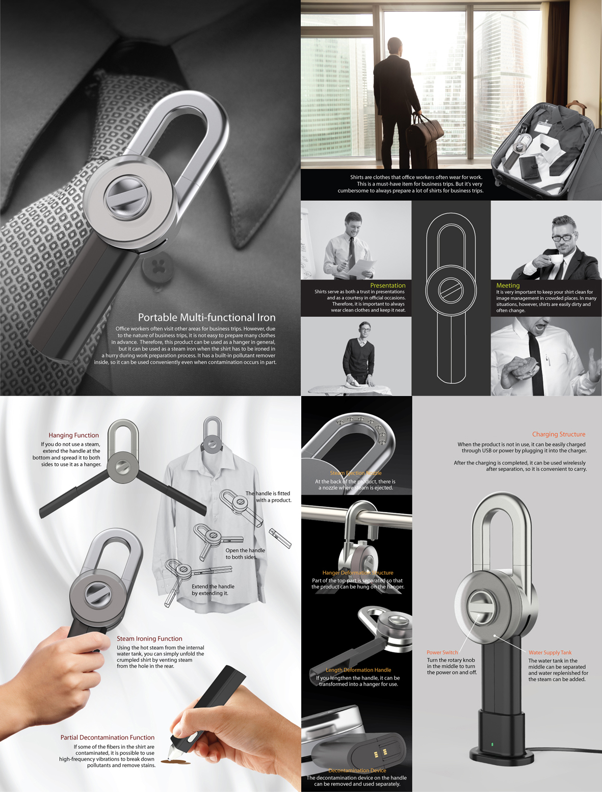 对于经常需要出差的白领们来说,西服和衬衫是必不可少的行李之一,但因行李箱空间有限,所以通常情况下,都无法带很多的更换的衣物,本组同学针对衬衫西服在箱子里面容易起褶皱不易处理的这一问题,设计了这款无线充电方便携带的电熨斗,不仅可以熨平衬衫等衣物上的褶皱,也可以去除衣料上沾染的食物饮料污渍,便于携带,使用方便。