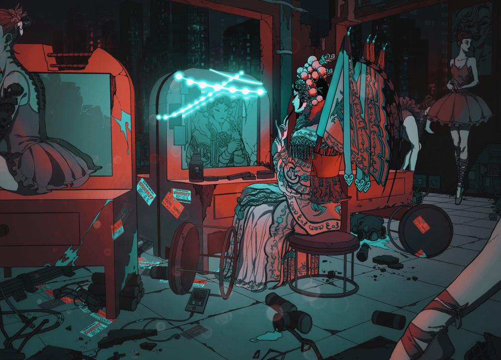 《游·戏》(Game)的作者是伟德官网漫画学院18级漫画(1)班学生崔淇文馨,插画融入了中国古代建筑、舞狮、脸谱以及京剧等具有代表性的中国元素,同时背景采用了充满游戏感的赛博朋克风格,在强烈对比下探寻兼容并蓄的表现方式。京剧服饰选择的《杨门女将》戏服,体现出中华民族文化传承中的不屈与坚韧精神。