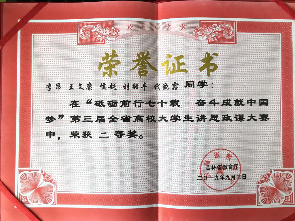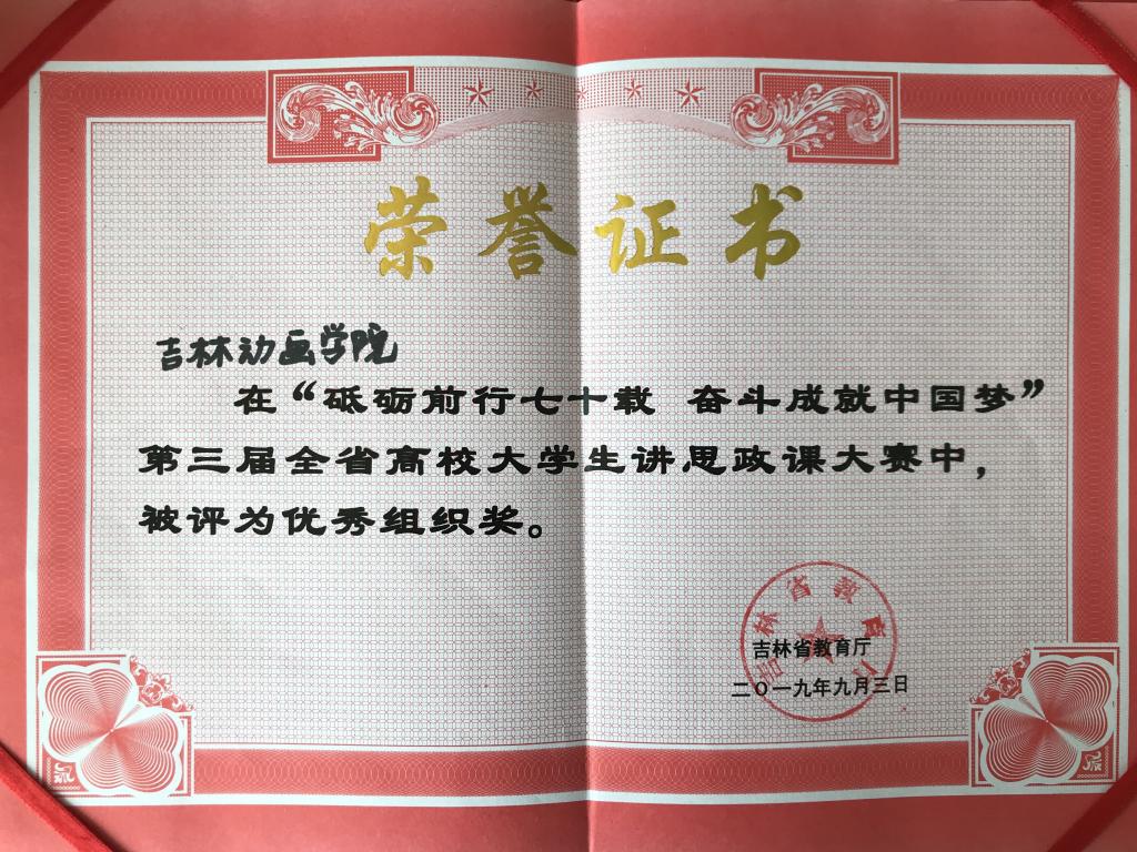 为深入学习贯彻全国教育大会、全国高校思想政治工作会议、全国学校思想政治理论课教师座谈会精神,庆祝中华人民共和国成立70周年,检验展示全省高校思政课“自学自讲 师生同上一堂课”教学改革成果,由省教育厅高校思想政治工作处、高等教育处指导,吉林农业大学承办的“砥砺前行七十载 奋斗成就中国梦”第三届全省高校大学生讲思政课复赛于2019年9月2日拉开帷幕。伟德bv国际体育斩获了团队二等奖和优秀组织奖。