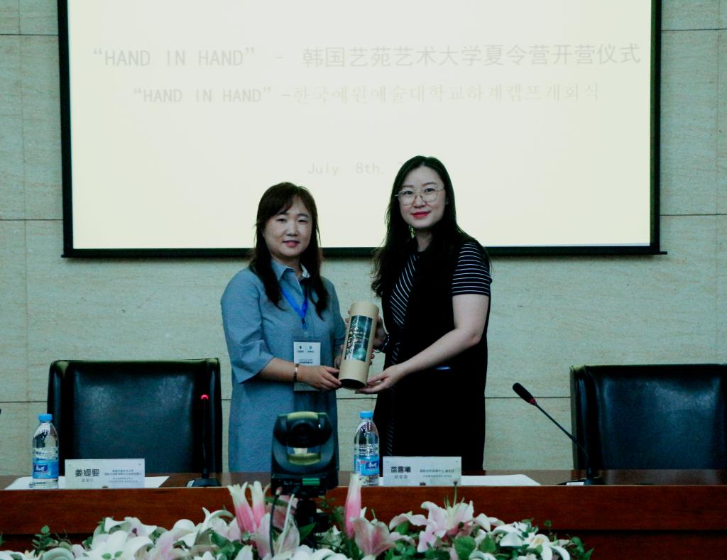 开营仪式上,苗露曦对伟德官网情况作了简单介绍,欢迎韩国学生到伟德官网深入参观交流和学习,苗露曦说,在为期6天的夏令营活动中,来自韩国艺苑艺术大学的同学们将亲身体验中国国画,参加参观伟德官网布朗工作室、德米特里工作室,参观伟德官网校史馆、动漫游博物馆等项目。韩国艺苑艺术大学中日业务负责人姜媞媐作为韩方代表发言,期待两校的合作能持续发展不断深入,并对本次“HAND IN HAND”韩国艺苑艺术大学夏令营充满期待。两校代表互赠礼物、合影留念。