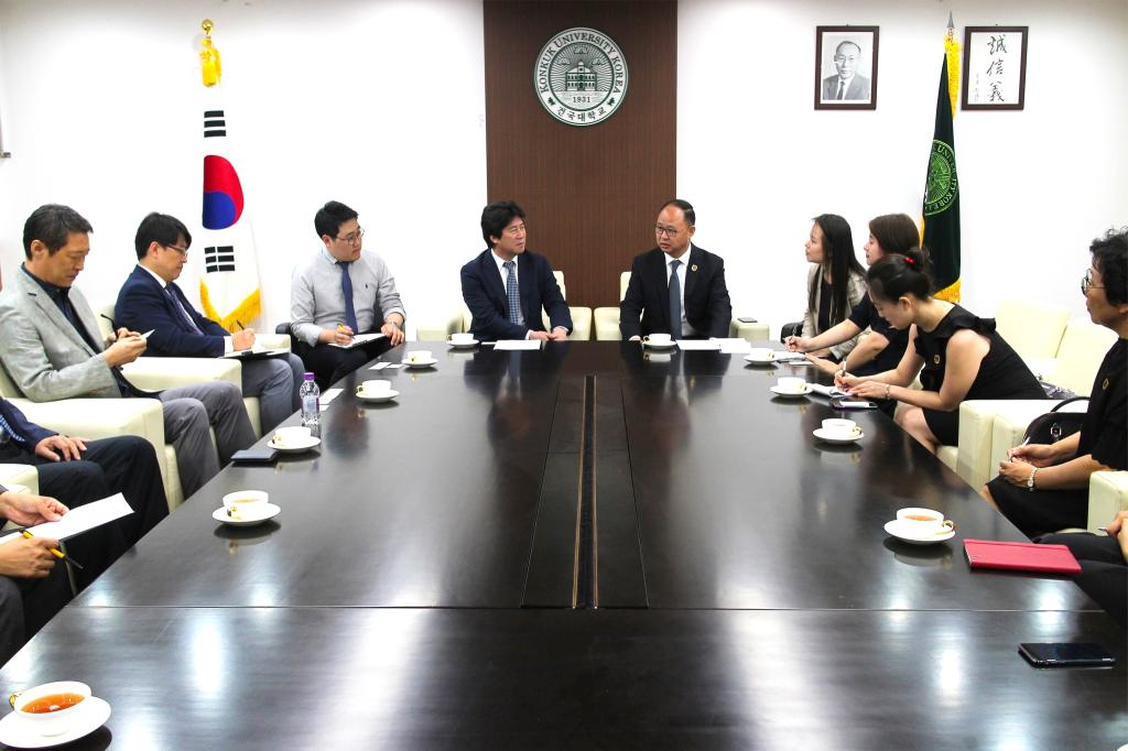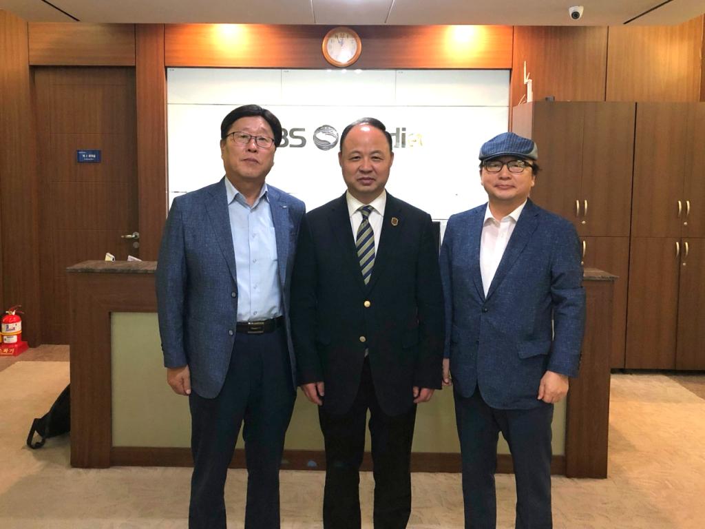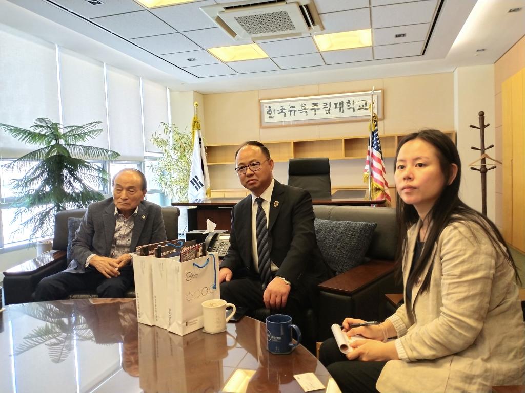 ▲伟德bv国际体育董事长、校长郑立国、韩国KBS媒体代表禹钟宅、具钟祥亲切会面
