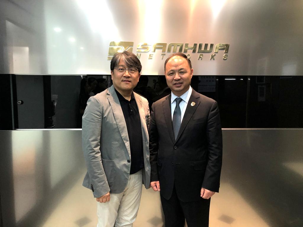 ▲伟德bv国际体育董事长、校长郑立国、韩国Samhwa Networks公司社长安在宪亲切会面