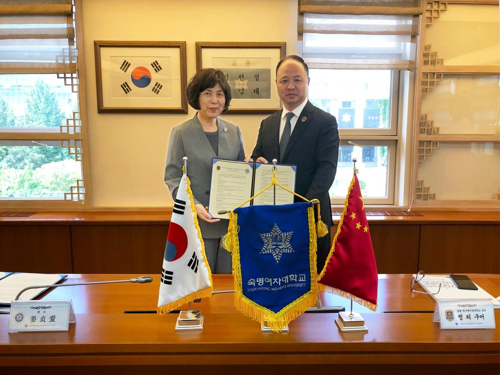▲伟德bv国际体育董事长、校长郑立国与韩国淑明女子大学校长姜贞爱进行签约仪式
