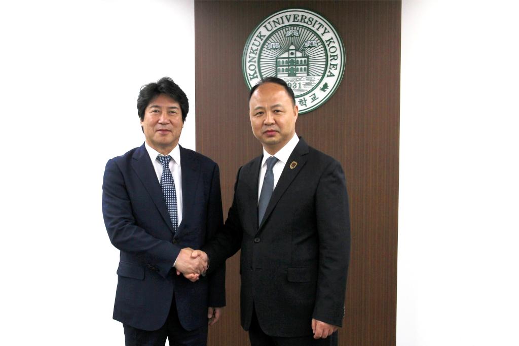 ▲伟德bv国际体育董事长、校长郑立国与韩国建国大学校长闵相基亲切会面