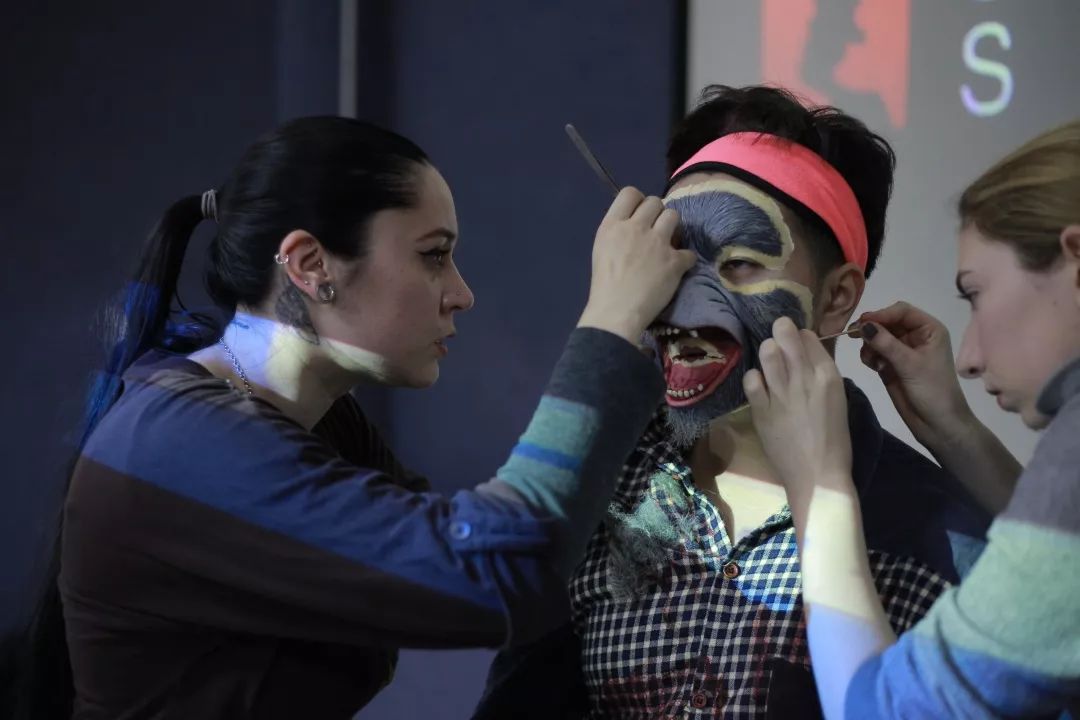 影视造型学院本次交流学习围绕着特效化妆技法进行,最终以特效化妆秀的形式向大家展现交流成果。通过美国影视特效化妆学校的讲师视频教学示范,从精质土的雕刻技法分解步骤、快速伤口制成、翻制模型制成,到可溶性硅胶假皮制作、发泡乳胶皮制成等,现场实操美国好莱坞著名电影《暮光之城-狼人》的特效化妆发泡乳胶皮的整体造型。