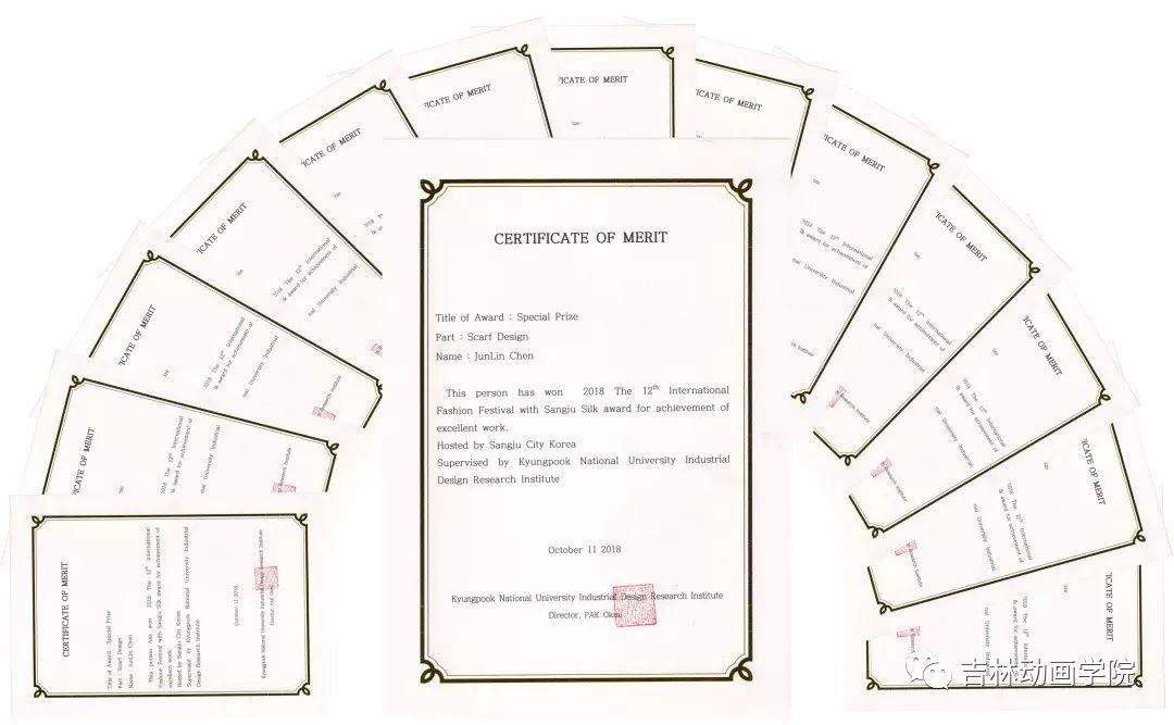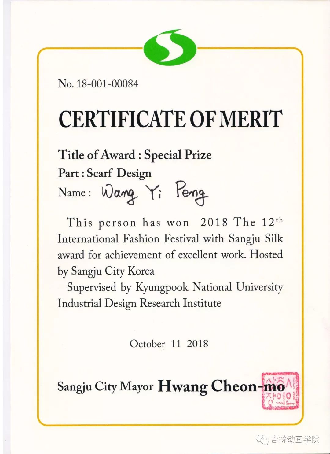 2018年10月11日,伟德bv国际体育设计学院视觉传达专业徐欣大师工作室张书宁、陶思航等14名学生设计的作品荣获第12届韩国尚州传统丝绸国际时尚节“特别贡献奖”,其中王艺澎同学设计的丝巾作品《四季变化》获得该展览的“尚州市长特别奖”。