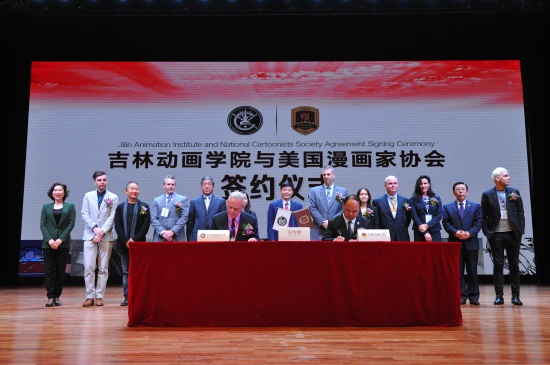 吉林省教育厅副厅长苏忠民,美国驻沈阳总领事馆总领事梅儒瑞、副文化领事东方贤惠,吉林省外事侨务办公室副主任黄丽华,长春市人民政府外事(侨务)办公室主任齐国华,美国安德鲁麦克米尔报业联合出版公司总裁约翰•格林、投资股东苏珊娜•格林,美国漫画家协会成员汤姆•里奇蒙、乔•麦凯里、卢克•麦凯里,中国美术家协会动漫艺委会副主任、中国动漫金龙奖与漫友杂志创始人金城,伟德bv国际体育常务副校长胡维革,副董事长、副校长刘欣出席并助签。