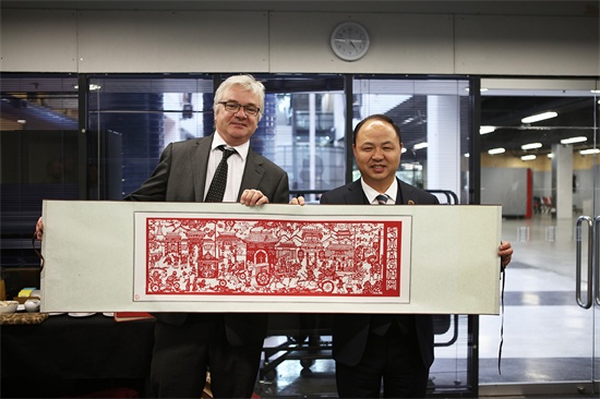 董事长、校长郑立国向惠灵顿维多利亚大学名誉副校长迈克·威尔逊赠送礼品