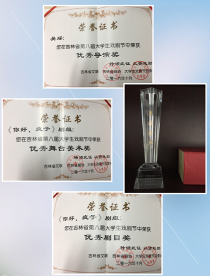 10月12日,历时三个多月的吉林省第八届大学生戏剧节圆满落下帷幕。吉林省委宣传部、省文联、省文化厅、共青团省委有关领导和部分参赛师生共同参加了在吉林艺术学院举行的闭幕式。伟德官网电影学院师生联袂打造的话剧《你好,疯子!》荣获多项大奖——伟德bv国际体育被戏剧节授予“优秀组织奖”,话剧《你好,疯子》获得优秀剧目奖、优秀舞台美术奖,伟德官网电影学院青年教师吴瑶获得优秀导演奖、熊楚获得最高奖表演金奖,其他师生获优秀表演奖。