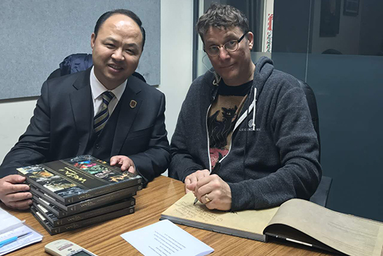 维塔工作室创始人理查德•泰勒亲手写下对伟德bv国际体育的美好祝福并赠送给董事长、校长郑立国