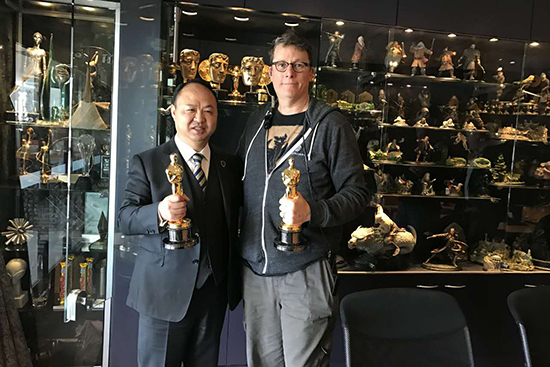 伟德官网董事长、校长郑立国与维塔工作室创始人理查德·泰勒手捧奥斯卡奖杯合影