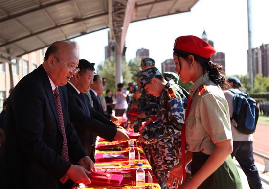 学校、部队领导为获得军训先进连队颁发锦旗(邓思捷 摄)