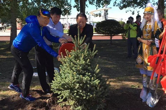 在“疯狂马拉松”开跑前,主办方启动了“万众之树”计划——组委会携带着由林业专家精选一棵云杉树苗,和“疯狂马拉松”团队一同出发,在沿途各地收集当地的一把黄土,再取一些当地的水,全部汇聚于终点三亚,在那里种下这棵“万众之树”。它象征全民精神的凝聚力。26日上午,一位同江市赫哲族老人铲土,寓意传统;与此同时,取水工作也于松黑两江交汇处完成,由赫哲族少女取水,寓意希望。取水取土工作完成后,这棵云杉树苗也将开启属于它的万里疯狂之旅。