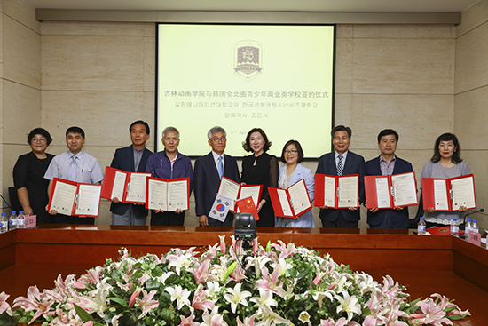 参观结束后,在产业大厦二楼大会议室举行了签约仪式。伟德bv国际体育副董事长、副校长刘欣,国际交流学院副院长王军、副院长鲍怡萍,韩国全北地区青少年商业类学校(8所)的校长、随行教师、学生代表出席签约仪式。
