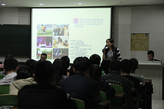 王会萍副院长向新生们全面介绍了广告学院的发展特色。她首先代表学院向一直陪伴新生军训的辅导员致敬,让新生们为自己的独立生活、军训后的完美蜕变而鼓掌。面对新生们专注的目光,她深情地传达这所学校发展传承的精神。在刚刚结束的十五年校庆中,广告学院确定了“向新高度进发—国际广告格局中广告人新视野”的主题,四位行业大咖齐聚,以2015纽约广告节精品展为主打,完美地向校庆十五周年献礼,师生们共享校庆十五年建设的荣耀。她以广告学院建设发展中的实例,向新生们展示广告学院“大师讲堂”、重磅展赛、学产对接实践教学项目三大特色。她提到学院精心准备的新生入学教育体系,在以后的一段时间里,广告学院的领导、老师们将与新生们深入互动,帮助学生们更好地适应大学生学习生活。