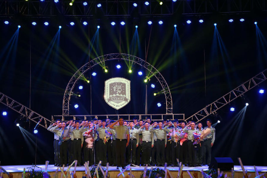 迈着整齐的步伐,喊着响亮的口号,63980部队全体教官走上迎新晚会的舞台,倾情献唱《军歌嘹亮》。唱起军歌,豪情万丈,凯歌高唱,军歌回荡,全场观众在歌声里体会到了中国人民解放军的英勇气势。2015级全体新生辅导员合唱《手牵手》,台风极具亲和力,嗓音颇具穿透力,和台下观众亲密互动,high翻全场。18天的军训生活,让同学们、教官们、辅导员结下了深厚的友谊,即将离别,同学们千言万语涌上心头。同学们纷纷跑上舞台拥抱、献花,哭声、掌声、欢呼声、呐喊声汇聚到一起,见证了教官们、同学们和辅导员之间的真挚情感。