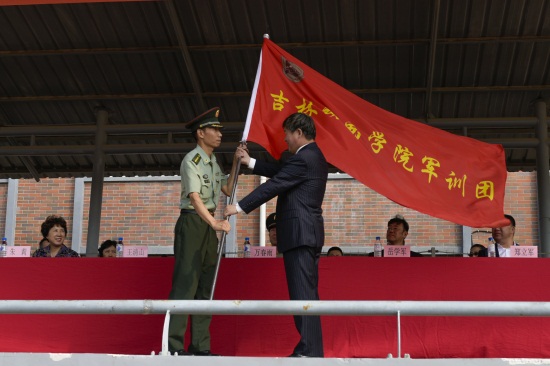 学校党委书记王清山向63980部队授予伟德bv国际体育军训团团旗(高雪松 摄)