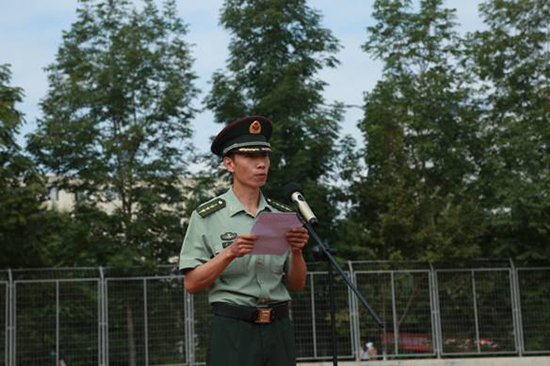 军训团团长李雄上尉在升旗仪式上作重要讲话:“铭记历史,铭记先烈,这是我们全民族共同的记忆,是我们全民族前行途中的精神动力。为纪念抗日战争胜利暨世界反法西斯战争胜利70周年,我们全体教官和2015级新生在这里举行庄严的升旗仪式,以此纪念那些为了民族而牺牲的人们共同经历的那些生与死的磨难、血与火的洗礼,并以此告诉世人,铭记历史、缅怀先烈、珍爱和平、开创未来。希望同学们一定要明确这段屈辱历史的真相,学习人民众志成城、不惜生命捍卫祖国尊严的精神,立志为繁荣祖国事业而勤奋学习。”