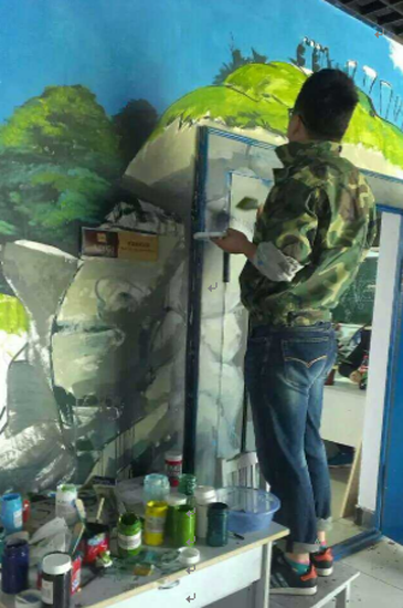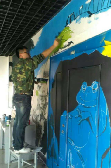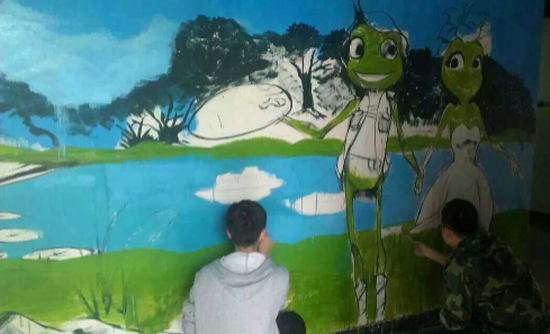 营造良好的校园文化,打造鲜明的学院特色,漫画学院“青蛙王国”主题墙绘用清新靓丽的色彩驱走了夏日的炎热,为莘莘学子送上一份清凉、一份童趣。