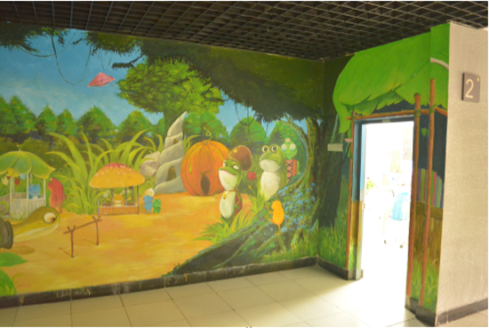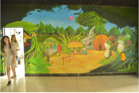 墙体主题为形态各异的青蛙精灵,构成了一幅创意新颖的墙绘版本“蛙国世界”
