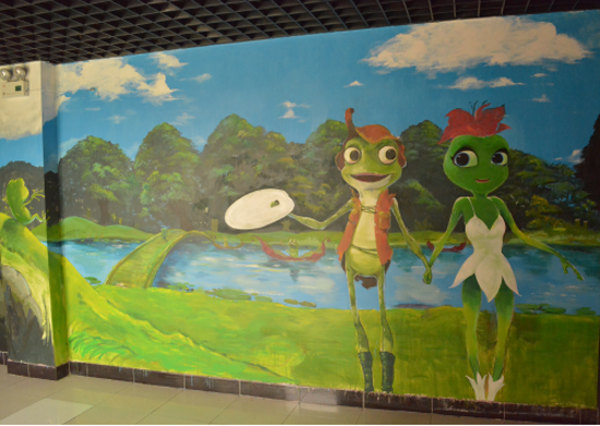 墙绘顺利完成,再现了《青蛙王国》影片中熟悉的经典场景