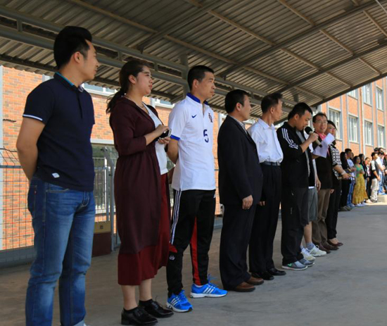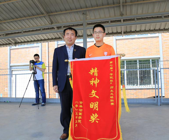 学校领导和老师为获奖集体和个人颁发奖杯、锦旗。历经一个月的师生足球联赛画上圆满的句号。