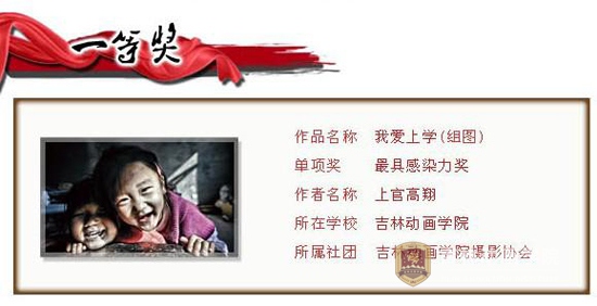 传媒分院摄影系09级毕业生上官高翔,在社会实践时来到了农安县青山口乡柳条沟村小学。当时这所小学办学条件差、屋舍简陋、教学设备贫乏。但孩子们的学习热情高涨,求知欲望强烈。这些情景深深地感染了上官高翔,他用手中的相机拍摄了一组《我爱上学》的纪实摄影照片,在“最美中国”第九届全国大学生摄影展(参展大学679所、参赛者5.2万人、参赛作品5.5万幅)中,获得了唯一的一等奖。