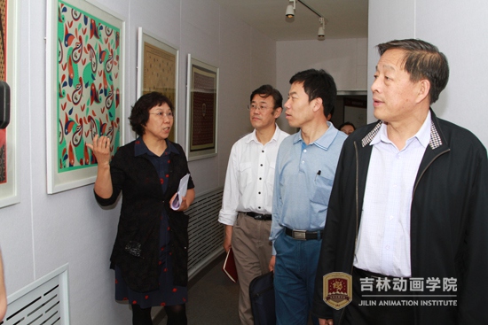 吉林省委高校工委第三督导组组长吴占军、联络员王俊波兴致勃勃的观看设计分院学生作品 张敏摄