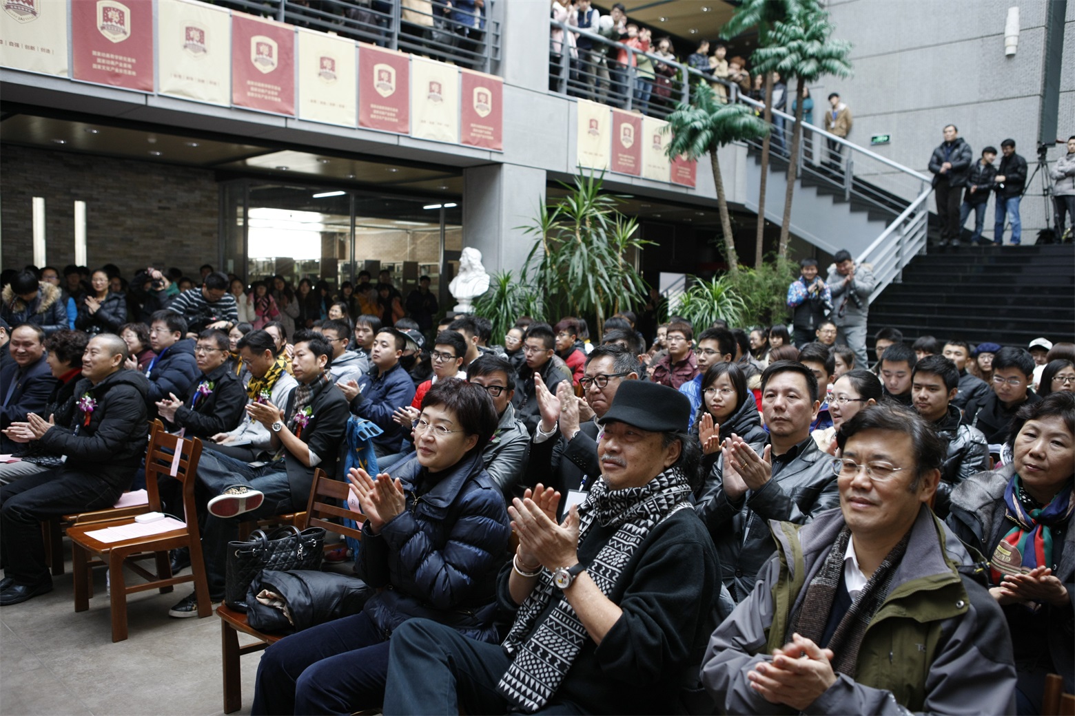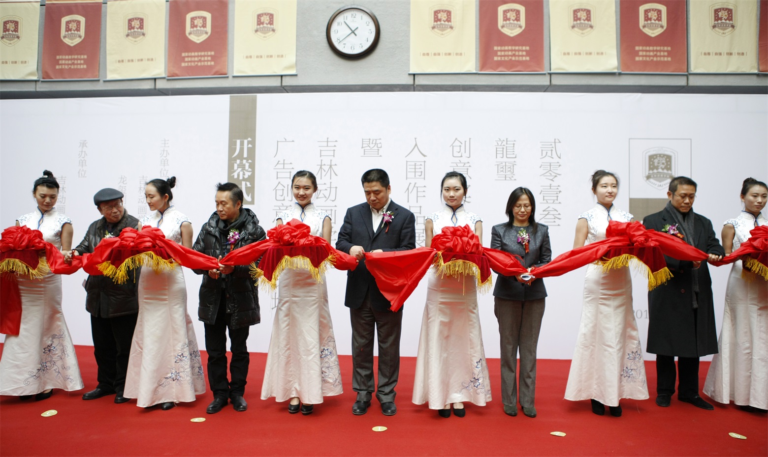 喜气盈盈,各位领导和嘉宾为“龍壐创意奖入围作品展暨伟德bv国际体育广告创意高峰论坛”剪彩。